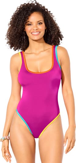 Modern lines meet shimmering detail in this sleek one piece swimsuit. Shimmer contrast binding frames the square neckline, armholes, and leg openings for a subtly luminous finish. Removable cups allow for customizable shaping and coverage. Rubber hold at the neckline, armholes, and leg hems ensures everything stays perfectly in place. With a high leg and modern seat coverage, this style combines sculpted confidence with effortless shine.
