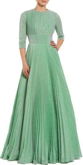 This shimmering georgette gown features pleats and 3/4 sleeves, offering an elegant and flattering silhouette perfect for formal occasions.