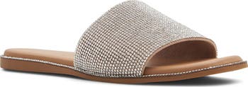 A layer of faceted crystals put the shine down low on this lightly cushioned slide that gives your casual look tons of glam from the ground, up.