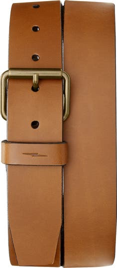 A signature lightning bolt stamps the keeper of a handsome leather belt secured by a roller pin buckle.