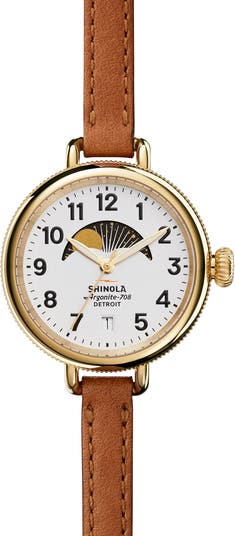 A beautiful moon phase indicator and coin-edge bezel refresh a vintage-inspired round watch assembled and fine-tuned by Detroit craftsmen. A precise movement comprised of Swiss and imported parts powers three-hand time, while a narrow topstitched leather strap provides a fitting finish to the classic style.