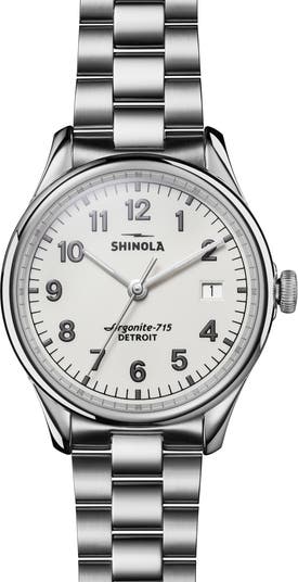 An entrepreneurial timepiece embraces traditional watch craftsmanship and captures the captivating style of the neo-classical Detroit building it's named after. The Vinton is the first from Shinola to feature a smooth caseback surface to custom engrave for a personalized, heirloom finish. It's the ultimate sophisticated style that works around the clock, distinguished by a glossy enamel dial with Super-LumiNova hands and indexes, and a double-domed sapphire crystal face encased in polished steel set on a dual-finish link bracelet.