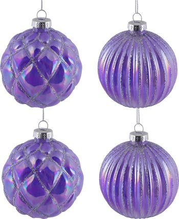 Add a touch of magic to your holiday decor with our purple glass ball Christmas ornaments. Each ornament is carefully crafted to dazzle, featuring a unique design that captivates the eye. Whether it's the sleek geometric pattern or the elegant ribbed texture, these ornaments promise to elevate your tree with sophistication. Complete with sparkling glitter accents, they're sure to make your season merry and bright. Product Features: 4-piece set Color: purple Finish: shiny Iridescent Embellished with silver glitter Balls are equipped with silver ornament caps Come ready-to-hang on silver cords Dimensions: 3" (80mm) Material(s): glass/metal