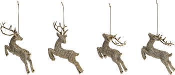 Enhance your holiday decor with the Transpac Resin Shiny Gold Reindeer Ornament Set of 4 This stunning set features four beautifully crafted reindeer ornaments that add a touch of elegance to your Christmas decorations Each ornament measures 4 inches in height 5 inches in length and 3 inches in width making them the perfect size for your tree or home display The shiny gold finish brings a festive sparkle to your indoor space Crafted from durable resin these ornaments are designed for easy care simply spot or wipe clean to keep them looking their best Ideal for adding a luxurious touch to your holiday season these ornaments are a must have for your Christmas collection