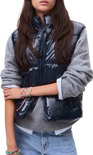 Glam up your cold-weather looks with this shiny channel-quilted puffer vest framed by a cozy stand collar and handy front pockets.