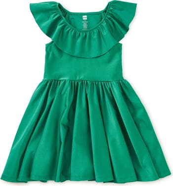 A brand-new silhouette for Tea, designed to shine at every celebration. The fitted bodice and full circle skirt create a beautifully twirl-ready shape, while the statement ruffle neckline adds extra flair.The elastic neckline offers multiple ways to wear it--on the shoulders, off the shoulders, or styled one-shoulder for a fun twist. Crafted from a soft, stretchy nylon-spandex blend with a subtle sheen, it's made for special moments, big spins, and channeling a little flamenco-inspired drama along the way.