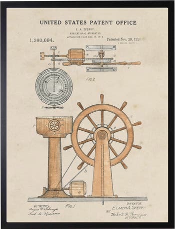 This vintage-inspired print, framed in a black wooden frame, features a ship wheel patent. Sized at 16 inches by 20 inches, this made in the USA frame makes for a beautiful addition to any wall.