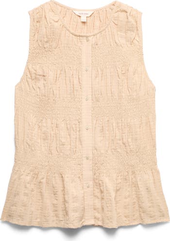 Allover shirring adds pretty texture to this lightweight button-front top made of cotton and trimmed with ruffles at the sleeves and hem.
