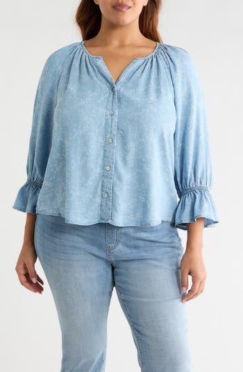 Feel like your floating through warm-weather days in this lightweight relaxed-fit top made from breathable chambray and charmed with shirred detail and bell sleeves.