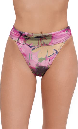 A shirred waistband flatters hip-slung bikini bottoms that offer stunning mesh and moderate rear coverage for total confidence on the sand.