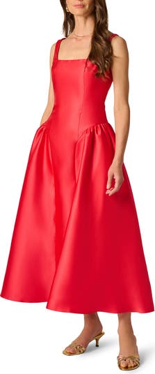A corset-inspired bodice adds subtle sensuality to a vibrant cocktail dress cut from a swishy fabric and perfected with a pair of discreet pockets.