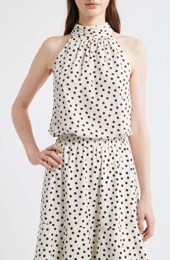 Bold polka dots put a retro spin on this woven sleeveless top complete with a band collar.