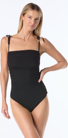 For an ultra flattering fit on a simple silhouette, try this shirred one piece swimsuit. In statement solids with shirring and tie straps, it's a timeless one piece swim option.