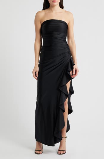 Grippy tape along the neckline lends a secure fit to this strapless gown featuring a bold ruffle that trails down one side.
