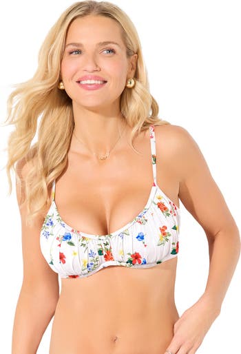 Supportive and stylish, this underwire bikini top features a hidden soft-cup underwire for bust support and shaping. Removable push-up cups allow you to further customize your support. The scoop neckline and underbust are softly shirred for gentle definition, and adjustable back straps feature a sliding J-hook for multi-way styling. Power Mesh–lined back wings with a G-hook closure offer a smoothing, secure fit.