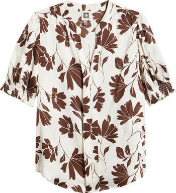 Soft shirring releases to ease the fit of this short-sleeve satin top in a print that'll mesmerize everywhere you go.