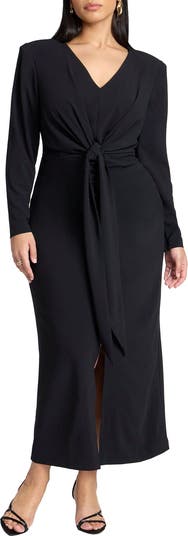 A front tie creates a gathered effect on a long-sleeve dress cut with a touch of stretch for graceful movements throughout your special event.