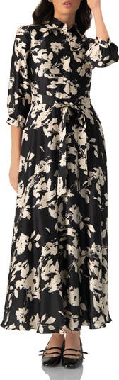 This elegant maxi dress features a classic shirt collar, long sleeves, a waist tie for a flattering fit, and a stylish print.
