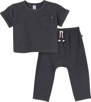 Outfit your little adventurer with our toddler boy pants and shirt set, crafted from 100% cotton to ensure comfort on sensitive skin. Featuring a comfort-stretch waistband on the pants, this set offers a flexible fit that moves with your little one on their every adventure! The box waffle fabric provides a cozy and breathable feel, keeping your little one comfortable during all his activities. Whether it's a day at daycare or a weekend adventure, this set is designed to keep up with your energetic toddler's busy schedule. Our essentials have been independently certified with STANDARD 100 by OEKO-TEX® so that you don’t have to worry about harmful substances in your little one’s wardrobe. Pack includes two-piece pants and shirt set.