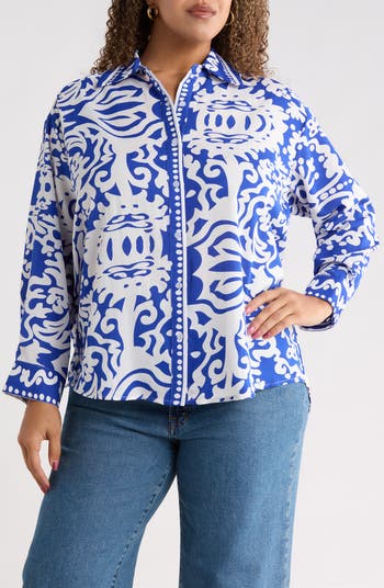 A vibrant print covers this lightweight button-up shirt cut in a relaxed fit that makes it perfect for wearing solo or layering into your look.