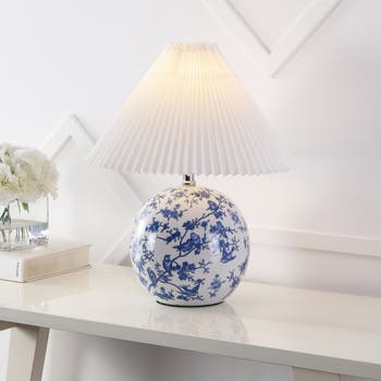 Our classic take on Chinoiserie features a traditional hand-painted floral design on a round ceramic lamp base. This timeless lamp features a tapered, pleated shade for cottage-inspired style. Try a pair of these stylish lamps in a bedroom, living room, or dining room.