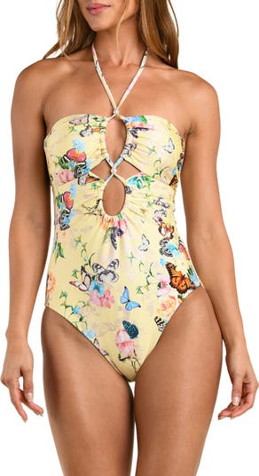 An enchanting butterfly print covers this cutout one-piece swimsuit featuring powermesh lining for a smooth and supportive fit and pearly hardware that elevates the look.