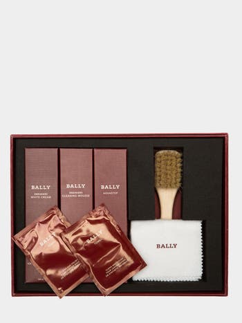 Housed in a shoebox style package, the premium shoecare kit includes a brush, cleaning mousse suitable for all types of leather, suede and textile, a whitening cream for use on white leather, vinyl and canvas sneakers, a double sided towel with a rough side for tough stains and a soft side for general cleaning, two wipes, and a colourless Aquastop treatment used to protect leather, suede and fabrics against dirt, damp and stains.