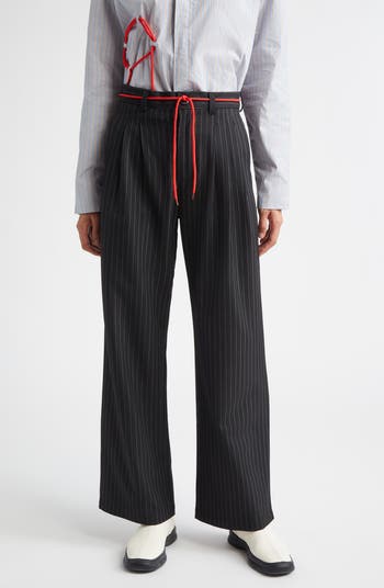 From the hands of Sri Lankan artisans to the creative heart of NYC, these pleated pinstriped pants are a true journey in craftsmanship. The slender shoelace belt continues the red-threaded accents woven throughout Kasuni Rathnasuriya's collections.