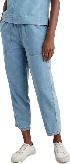 A stretchy drawstring waistband and soft, lightweight denim kissed with organic cotton bring warm-weather appeal to these straight-leg pants cropped at the ankle.