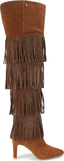 Rhinestone-encrusted fringe cascades down the shaft and creates a boho aesthetic on an over-the-knee boot featuring subtle logo hardware and lifted by a tapered heel.