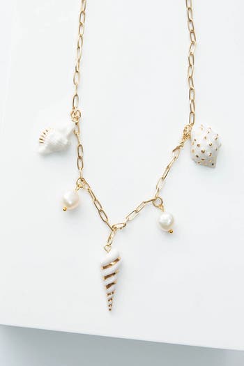 A little piece of the sea, made to wear every day. The Shoreline Charm Necklace features a curated mix of porcelain shell charms, luminous freshwater pearls, and a 14k gold-plated stainless steel chain for a look that feels both playful and polished. Each charm adds its own story-textured shells, glossy pearls, and a spiral drop that catches the light-creating a layered, collected feel in one easy necklace. Designed to be worn solo or stacked, this piece brings soft coastal energy to everything from casual tees to breezy dresses.