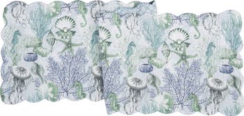 Elevate your dining experience with the 14" x 51" Shoreline Waters Cotton Table Runner, designed to add a refreshing coastal flair to your home. Featuring a stunning nautical theme, this table runner showcases intricate designs of coral seashells, sea shells, and seahorses, capturing the serene beauty of the ocean. Crafted from high-quality cotton, this runner combines both softness and durability, making it a practical yet stylish addition to your kitchen or dining table. Whether you're hosting a seaside-inspired dinner party or enjoying a casual meal, this table runner will effortlessly complement your space. It's versatile enough to be used throughout all seasons, bringing a touch of warmth and elegance during spring and summer or adding a refreshing contrast in the cooler months. Machine washable for easy care, this table runner maintains its charm and vibrancy through countless uses, ensuring it remains a focal point of your table settings. Create a coastal retreat right at your dining table with this beautiful piece.