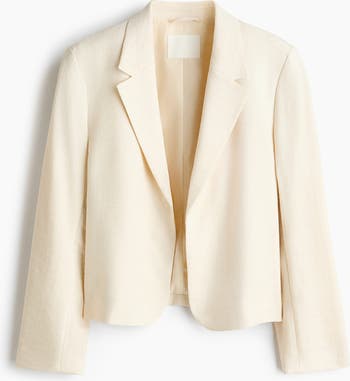 Short blazer in woven fabric with notch lapels, shoulder pads and long sleeves with a slit at the cuffs. No fasteners. Lined.