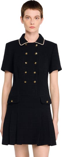 Short tweed dress with a shirt collar adorned with pearl trim, double-breasted top and decorative pockets on the skirt.
