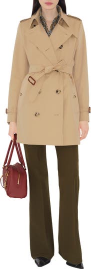A refined take on Burberry’s rainwear heritage, the Chelsea trench coat is cut close to the body for a clean, modern silhouette. The fitted style is made in England from shower-resistant cotton gabardine and detailed with leather-wrapped buckles. Tailored to a slim fit, the double-breasted design has a structured shoulder line, narrow sleeves, and a defined waistline. Wear it closed using the belt or open over dresses and separates to showcase the iconic check lining.||Double-breasted button closure|Hook-and-eye collar closure|Throat latch|Epaulettes|Storm shield at back|Gun flap at shoulder|Leather buckle belt and cuffs|Side button welt pockets|Back button vent|Burberry Check lining and undercollar|Comes with a garment bag