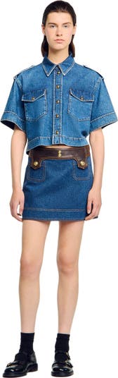 Short denim skirt with leather inserts at the waistband and buttoned patch pockets.