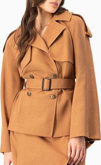 Sleek short trench coat with a belt for a tailored fit.