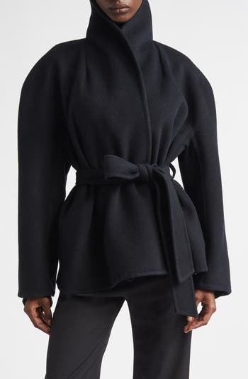 Demna distills his signature volume into a short wrap coat with wide sleeves and an exaggerated shawl collar that flips up for enhanced warmth and drama. It's cut from double-face Italian wool—making the interior as soft as the exterior—and lined with silky logo-jacquard satin.