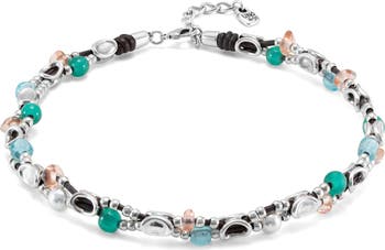 Short silver-plated necklace with double leather strap and links, pearls and multiple handcrafted colored crystals.