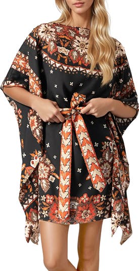 - Short floral print dress, batwing sleeve style, round neckline, and waist ribbon.