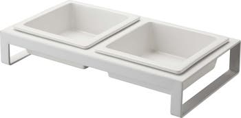 Reduce the strain on your pet's neck as they eat with this stylish elevated diner that features a powder-coated steel frame housing two ceramic bowls. Raised rims on the bowls help keep food and water off the floor, and padded feet on the frame prevent scratches.