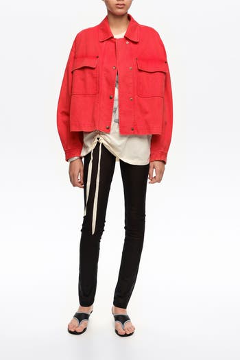 Cropped straight-cut jacket in a cotton blend. Designed with a shirt collar, concealed front zip with press-studs, long shaped sleeves with press-stud cuffs, and chest flap pockets.