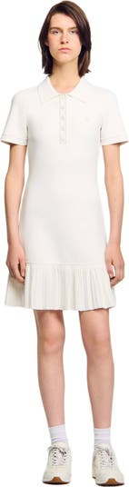 Short knit dress with short sleeves, buttoned polo collar, and pleated skirt.