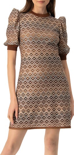 - Short knitted dress in brown shades with short puffed sleeves and Cardigan.