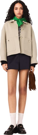 The new Maje wardrobe is inspired by the quiet strength of modern women, blending metropolitan sophistication with bold technical details.This short beige wool-blend jacket has a straight, loose fit at the front, while the back is subtly flared thanks to refined pleating. Its patch pockets and wide sleeves with buttoned tabs create a structured and bold look. For a graphic, contemporary silhouette, pair it with navy shorts, a green waterproof hood, black loafers and a burgundy M bag.