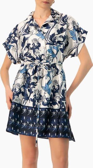Short dress with a shirt collar, short dropped sleeves, and a waist tie.