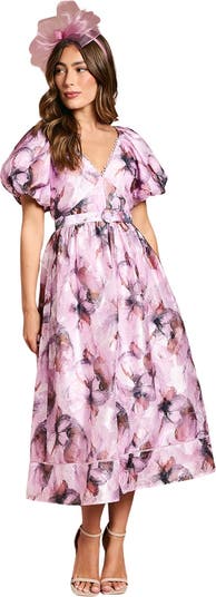 Elegant Fit and Flare dress with puff sleeves and a stylish belt, perfect for weddings or special occasions.