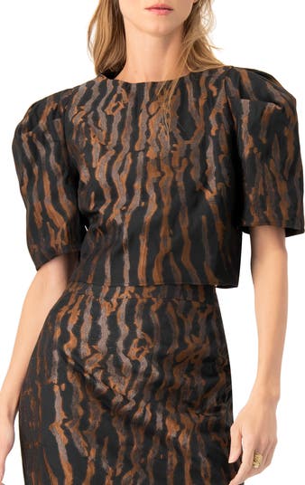 Crop short blouse in jacquard with a round neckline and puff short sleeves