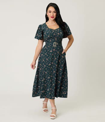 Step into the glamour of the 1940s with this woven midi dress! Its short puff sleeves and sweetheart neckline exude excitement, while the godet skirt adds a touch of flair. Plus, it comes complete with side pockets, a back zipper, and a chic belt.