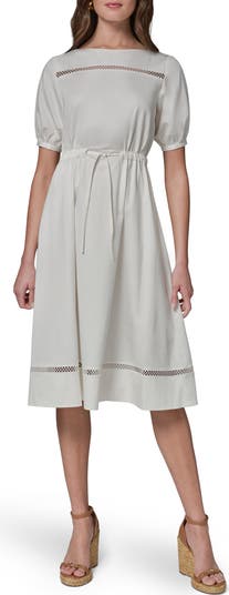 Lacy lattice embroidery enhances the vintage-chic appeal of this versatile A-line dress.